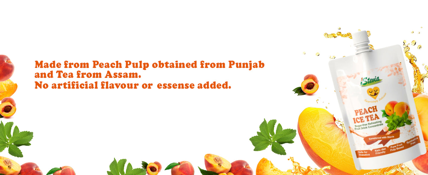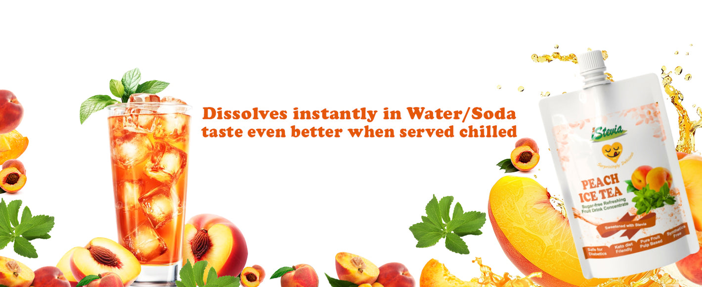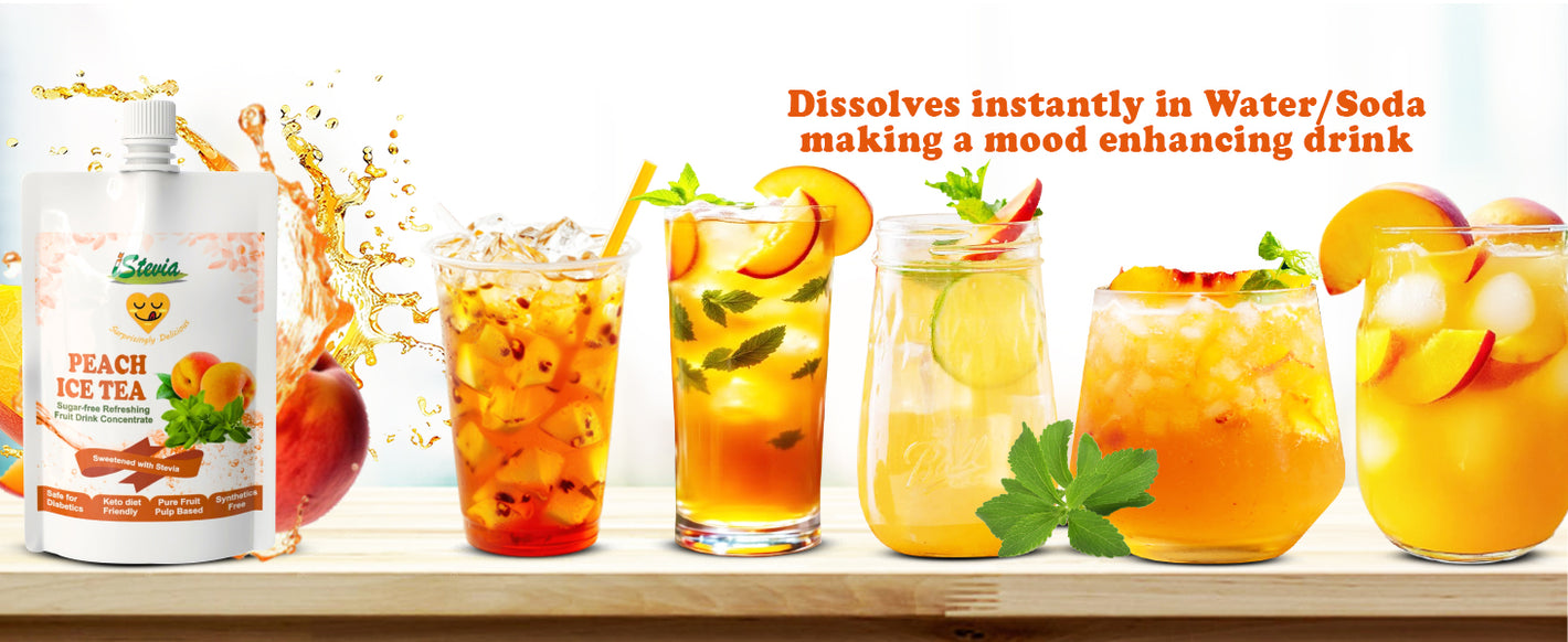 - iStevia's Peach Iced Tea – the principal ingredients are Fresh PEACH pulp, best LEAF TEA, Probiotic low glycemic index carbohydrates (D-glucitol, erythritol), Steviol glycosides as a plant based zero calorie natural sweetener