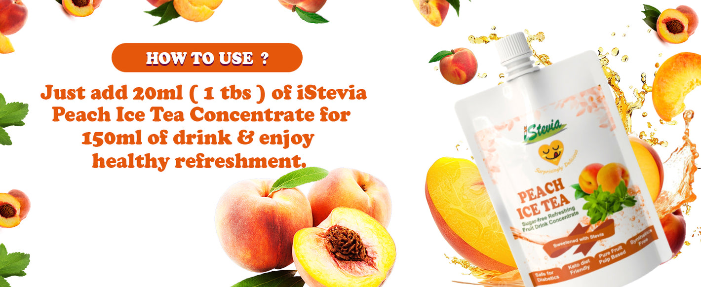 Just pour 20ml (about 4tsp) of iStevia's Peach Iced Tea on to a tall glass – fill it with ice, soda and water – enjoy the refreshing guilt free Peach Iced Tea drink